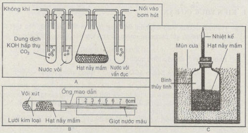 – Vi sao nước vôi trong Ống nghiệm hên phủi hình chứa hạt nảy mầm (hình 12.1 A) bị vẩn đục khi bơm hút hoạt động?
