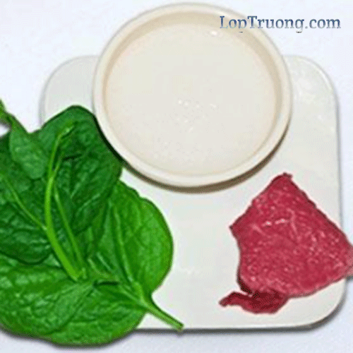 Bước 1: Cho thịt bò hòa với 1/3 chén nước, đánh tan (để khi nấu sôi, thịt không bị vón cục). Cho thịt bò đã đánh tan, bột gạo, rau vào 2/3 chén nước còn lại trộn đều.