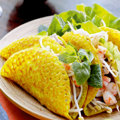 Bánh xèo thập cẩm có màu vàng từ màu của bột nghệ.