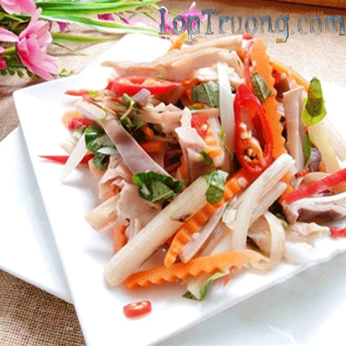 Bước 9: Trộn gỏi: trộn chung ngó sen + cà rốt + dưa leo, nêm chanh + đường + nước mắm vừa ăn. Cho bao tử + tôm vào trộn đều, cho rau thơm xắt nhỏ + củ hành tây + hành phi + ớt thái sợi + kiệu xắt mỏng + đậu phộng rang vào, trộn đều. Nêm lại vừa ăn.