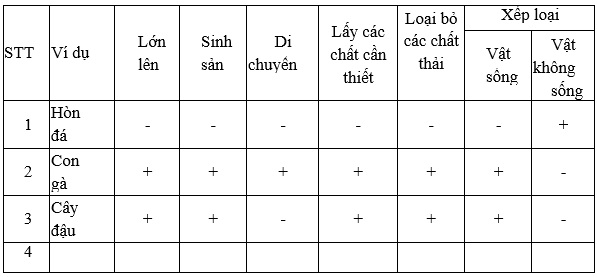 Dùng kí hiệu + (có) hoặc – (không có) điền vào các cột trôhg trong bảng sau cho thích hợp: