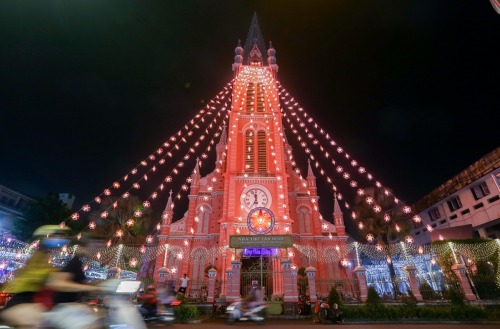 Nhà thờ Tân Định hay còn gọi là nhà thờ màu hồng, nơi này có kiến trúc độc đáo với màu sắc bắt mắt là màu hồng nên được người dân đặt cho cái tên thân thuộc đến vậy. Nơi đây đẹp nhất là vào dịp Noel bởi đây là điểm hẹn cho các tín đồ sống ảo thích chụp hình check in. Ngoài ra nhà thờ vào dịp Noel được các giáo dân trang trí với những bóng đèn đầy màu sắc, hang đá, cây thông lộng lẫy nên ở các dịp lễ hội hay Noel được rất nhiều người dân đến tham quan và chụp ảnh.