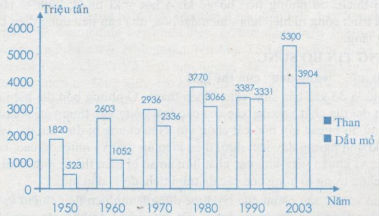 Nhìn chung sàn lượng than và dầu mỏ cùa thế giới thời kỉ 1950 – 2003 đều tăng: