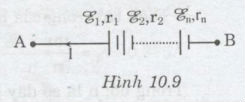 – Cách mắc nguồn điện thành bộ nguồn nối tiếp: Gọi I là cường độ dòng điện chạy trong đoạn mạch AB (từ B đến A), U1U2,…, Un là hiệu điện thế giữa hai cực của mỗi nguồn (hình 10.9).
