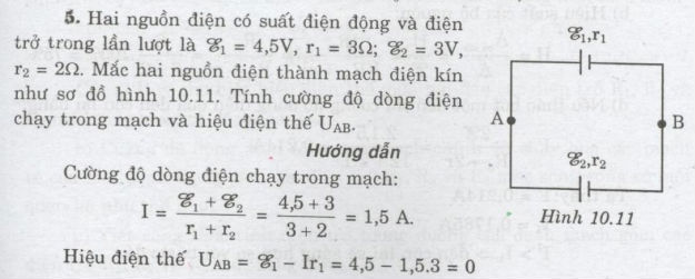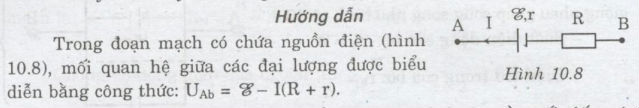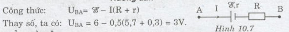 C3. Hãy viết công thức tính UAB đối với đoạn mạch hình 10.7 và tính hiệu điện thế này khi cho biết E = 6V; I = 0,5A; r = 0,3(ôm) và R = 5,7(ôm).