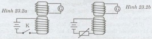 Trong hình 23.2b: Khi thay đổi cường độ dòng điện của nam châm điện bằng cách thay đổi trị số của iôn trở, từ trường của nam châm điện biến thiên làm từ thông xuyên qua ống dây ở phía trên cũng biến thiên, khi đó trong ống dây xuất hiện dòng điện cảm ứng và kim điện kế G bị lệch.