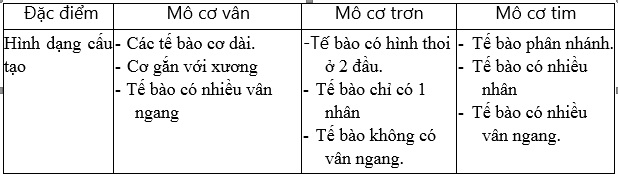 Giải bài tập 2 trong SGK. Cơ ván, cơ trơn, cơ tim có gỉ khác nhau về đặc điểm và cấu tạo, sự phán bô’ trong cơ thể và khả năng co dãn?