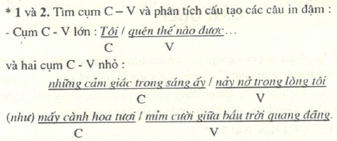 | Câu có một cụm C – V | Tôi quên thế nào dược những cảm giác trong sáng ẩy nảy nở trong lòng tôi như mấy cành hoa tươi mủn cười giữa bầu trời quang đãng | |