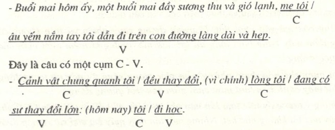 3. Câu có một cụm C – V là câu đơn (Buổi mai hôm ấy, một buổi mai đầy sương thu và gió lạnh, mẹ tôi âu yếm nắm tay tôi dẫn di trên con dường làng dài và hẹp.), câu có các cụm C – V không bao chứa nhau là câu ghép (Cảnh vật chung quanh tôi đều thay đổi, vì chính lòng tôi đang có sự thay đổi lớn: hôm nay tôi đi học), câu có cụm C – V nhỏ nằm trong cụm C – V lớn là câu phức (Tôi quên thế nào được những cảm giác trong sáng ấy nảy nở trong lòng tôi như mấy cành hoa rươi mỉm cười giữa hầu trời quang đãng.).