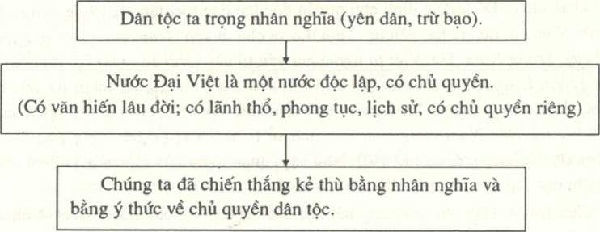 Nguyễn Trãi nêu lên tư tưởng nhân nghĩa, phải trừng phạt kẻ xâm lược, hung tàn đổ mang lại độc lập cho đất nước, thái bình cho muôn dân. Chân lí không thể chối cãi là nước Việt Nam là một nước độc lập, tự chủ. Những lí lẽ này đâ được chứng minh bằng thực tiễn : nước Đại Việt luôn trọng nhún nghĩa nên thời đại nào cũng có nhiẻu hào kiệt, luôn chiến thắng kẻ thù. Kẻ xâm lược làm việc phi nhân nghĩa cho nên đã phải thất bại thảm hại.