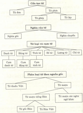 Kiến thức cơ bản về: cấu tạo từ, từ mượn, nghĩa và hiện tượng chuyển nghĩa của từ, các từ loại (danh từ, động từ, tính từ, số từ, lượng từ, chỉ từ), các cụm từ (cụm danh từ, cụm động từ, cụm tính từ).