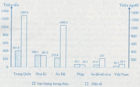 Biểu đồ thể hiện sản lượng lương thực và dân số của một số nước trên thế giới năm 2004