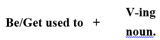 1. BE/GET USED TO: được dùng diễn tả sự quen thuộc. Sau be/get used to là một danh từ (noun), hay danh dộng từ (gerund: v+ing)