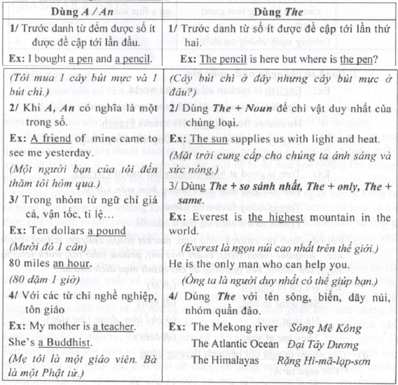 + Mạo từ bất định An dùng trước các danh từ đếm được, sổ ít, bắt đầu bằng nguyên ăm (a,i, u, e, o) hoặc h câm.